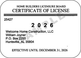 This is a great way for consumers to tell the difference from an Alabama Home Builder licensee who has passed examination and credit checks versus a handy man who advertises his city business license as "licensed." The Alabama Home Builder Licensure Board provides consumers with protection by the regulation of residential construction and remodeling and maintaining home building and remodeling standards.